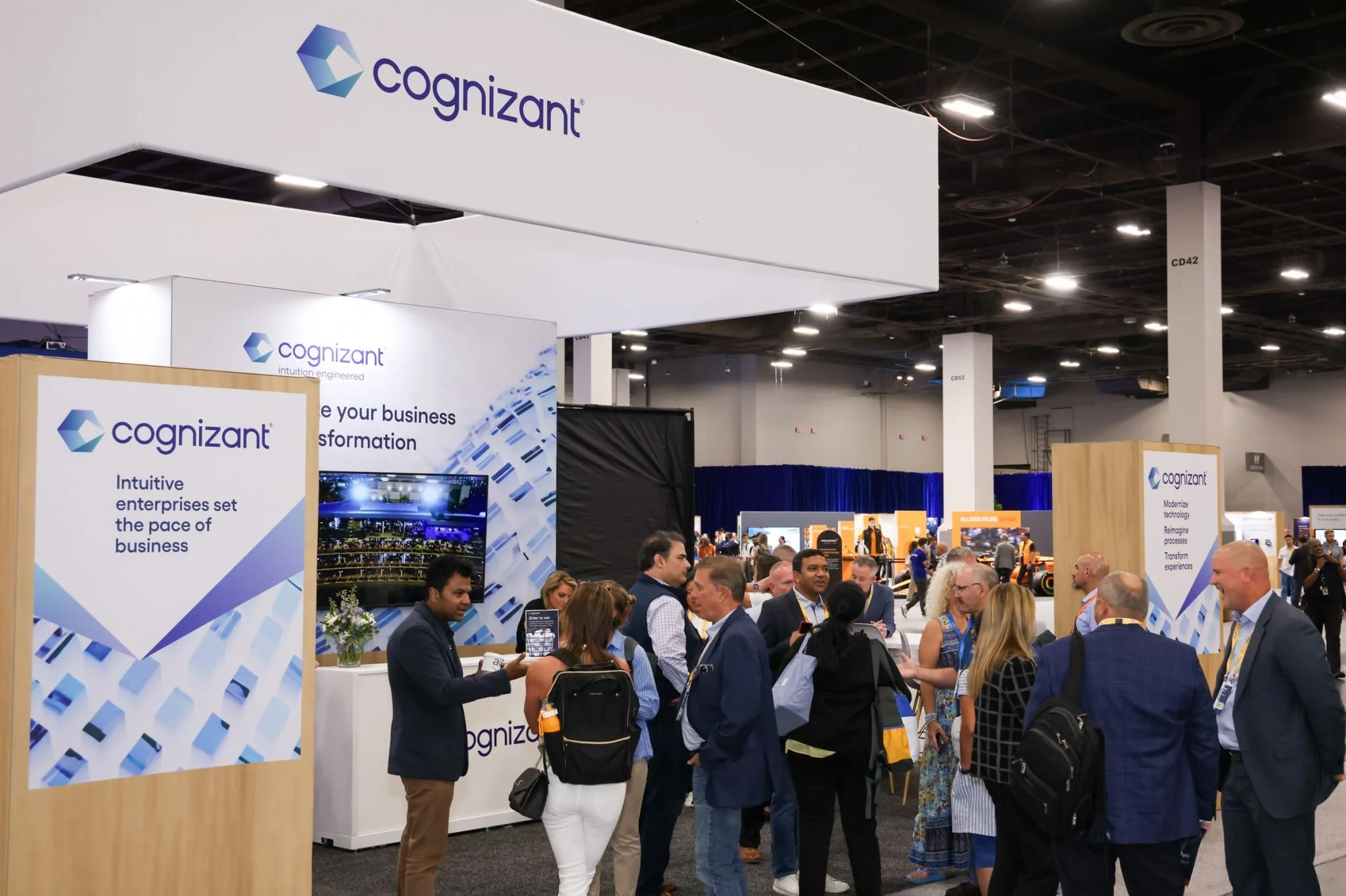 We moved from "Rockstar" to "Visionary." I developed a visual language centered on The Transformation Wave — using fluid, abstract data visualizations to represent the momentum of AI. The "Ignite Your Business" theme used a high-contrast application of Cognizant’s palette to break the "sea of blue" typically found at tech expos.
